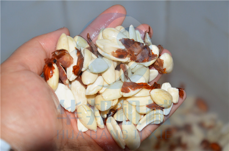 華邦機(jī)械杏仁/巴旦木仁去皮機(jī)采用純物理去皮,機(jī)械去皮代替人工去皮,采用循環(huán)水快速?gòu)氐紫吹艉颂胰时砻娴哪喙浮⒏∑さ取?/span>