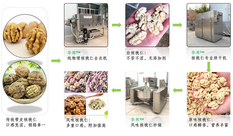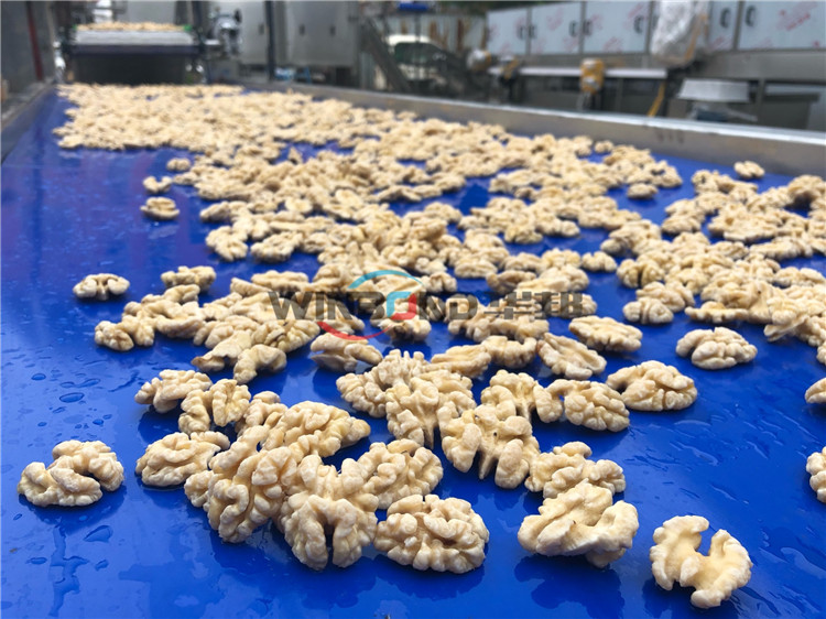 諸城市華邦機械有限公司 新研制的核桃仁去皮清洗機,采用純物理去皮方法,專門針對核桃仁表皮的沖洗,代替了傳統的化學泡制去皮,使產品更安全放心,連續式工作,操作簡單,去皮率高,自動化程度高,節省人工,可配套烘干箱、炒鍋、氣泡清洗機使用。