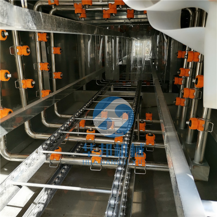 輸送筐子di一步:由不銹鋼鏈條勻速輸送到清洗機內