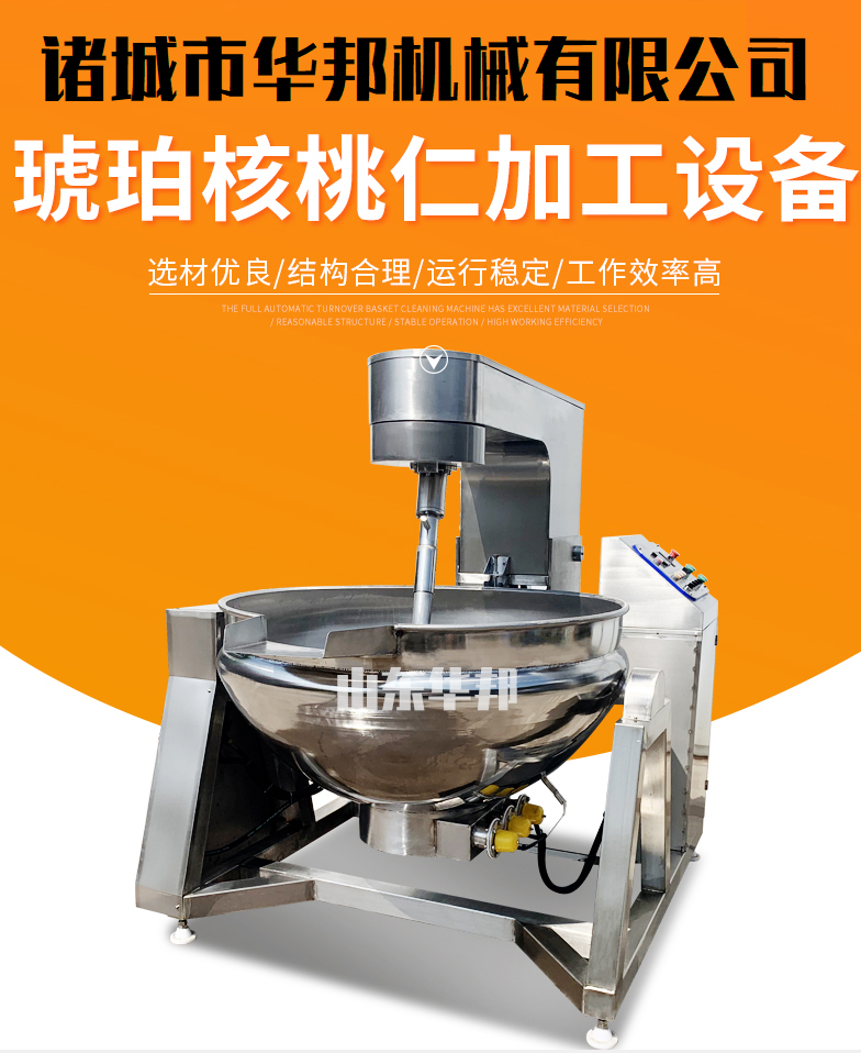 山東華邦機(jī)械生產(chǎn)的的琥珀核桃仁加工設(shè)備 結(jié)構(gòu)合理,操作簡(jiǎn)單:為了減少炸機(jī)的注油量,內(nèi)膽采用循環(huán)用油,保證炸出效果光澤的前提下,使無(wú)效的注油大大減少,縮短了炸油的使用周期,在很大程度上保證油的酸價(jià)和過(guò)氧化值的升高。同時(shí)采用自動(dòng)控溫、自動(dòng)攪拌、自動(dòng)出料,減小了工人的勞動(dòng)強(qiáng)度,提高了自動(dòng)化程度。