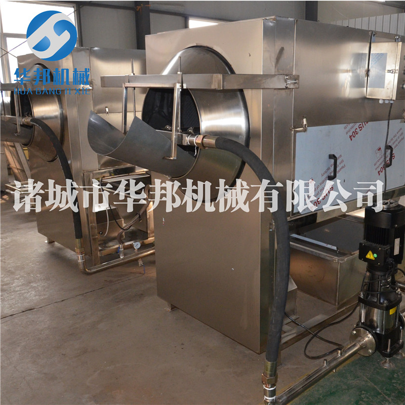 對核桃仁表面浮皮進行浸泡軟化作用,利于下一步的脫皮作業,核桃仁進入到浸泡機,浸泡時間可根據客戶自己的加工工藝自行設定,網帶運行速度可以無極調速,自動控溫,核桃仁均勻浸泡之后,自動進入到下一步工藝,滾筒式核桃仁脫皮機。