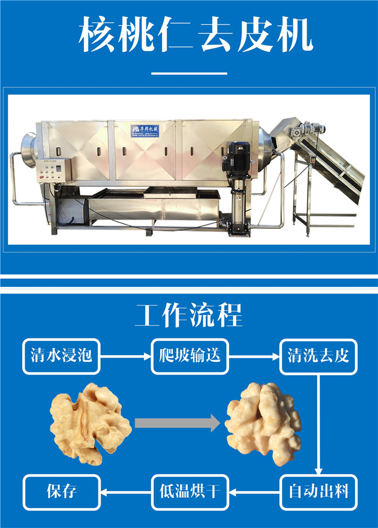 設有自動導料裝置,核桃仁皮自動分離,產品符合衛生標準,因核桃仁不易損傷故可提高質量!