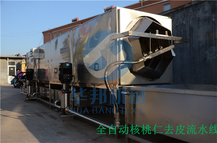 核桃仁去皮機,是用不銹鋼作為分滾筒的對輥軸,利用速差揉搓原理制造,配備了高性能減速電機和鏈輪傳動系統,工作當中可根據核桃仁的大小自由調節滾筒轉動的頻率,一道滾揉搓工序,去皮率達95%以上,同時配有二次清洗,可以清除核桃仁浮皮雜質.該機有兩種型號2000型,3000型,每小時產量分別是60公斤,150公斤,此設備操作方便,產量高,核桃仁去皮后損失小,是核桃仁的理想設備!!