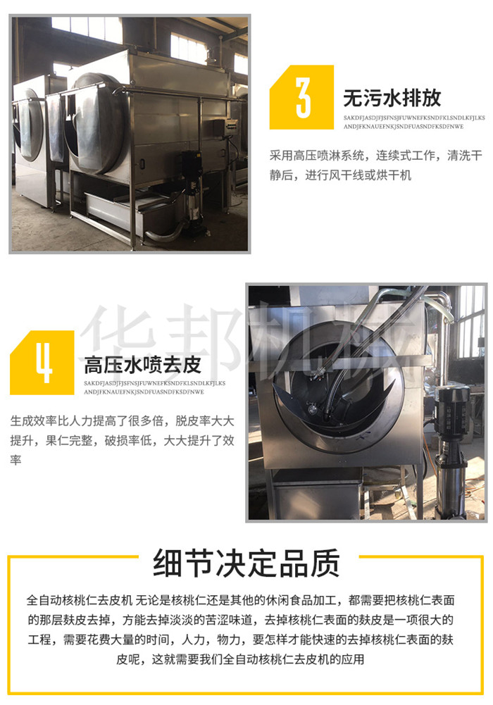 LN核桃仁去皮機主要作用:利用高壓水流沖洗掉核桃仁表面的皮衣,因為核桃仁表皮發(fā)澀,口感不好,在核桃露、核桃醬、保鮮核桃、琥珀核桃、核桃飲料等產品的加工過程中是一個困擾,山東華邦生產核桃仁去皮清洗機,專門針對核桃仁表皮的沖洗,連續(xù)式工作,操作簡單,去皮率高,自動化程度高,節(jié)省人工。