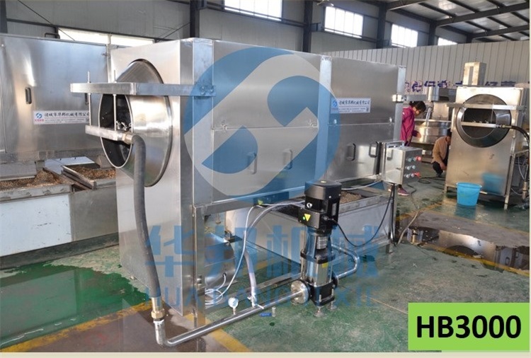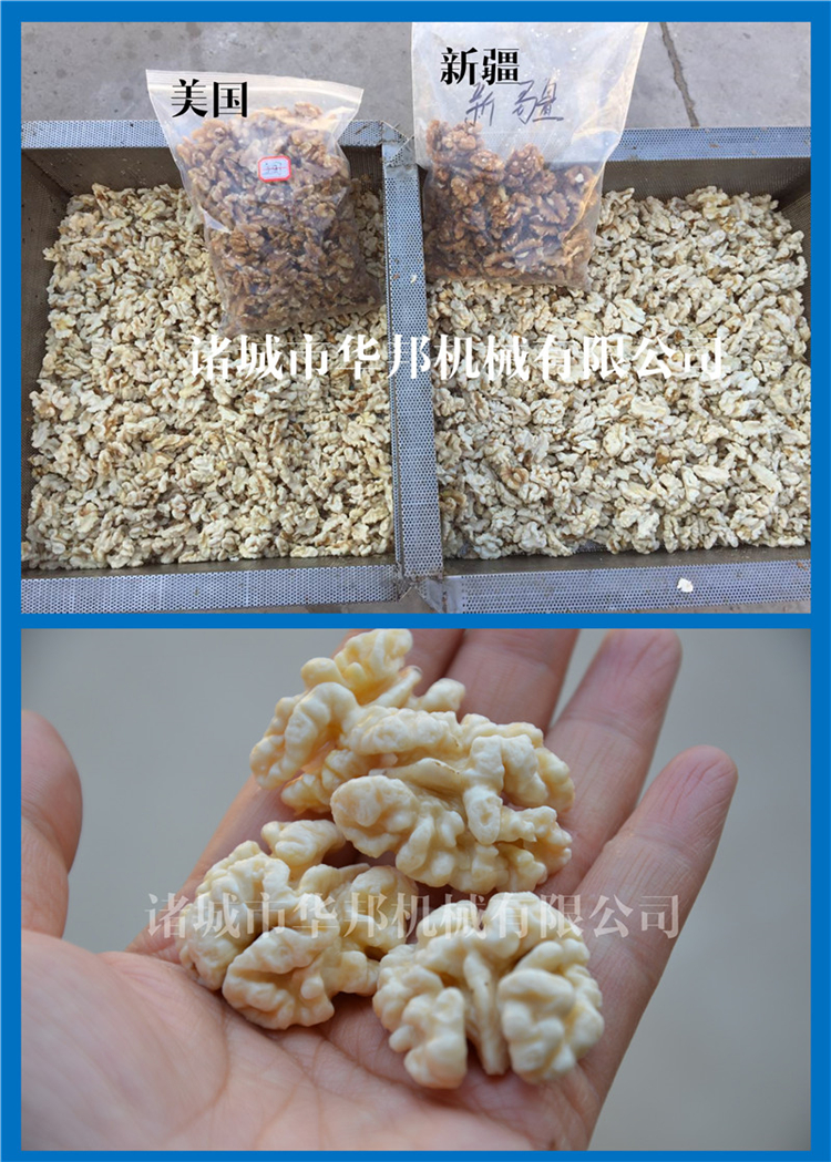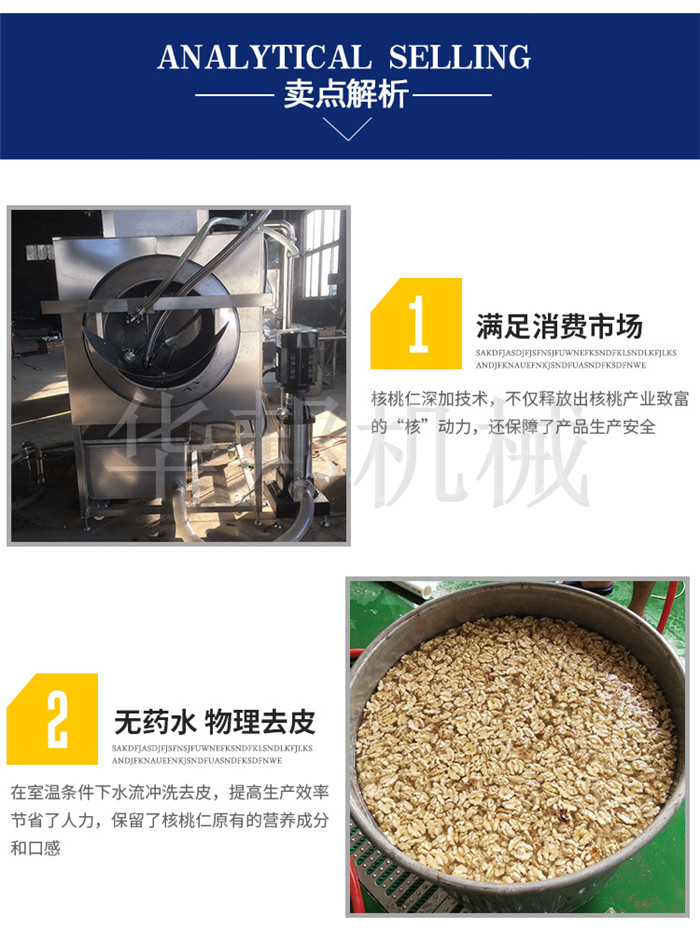 華邦機械純物理核桃仁去皮機(不添加堿,純清水浸泡)采用滾筒連續式工作,自動連續式的不間斷的翻滾配合多級高壓泵的作用,可以快速取出清洗掉核桃仁表面的浮皮,使用為了節約用水的原則循環利用,高效節能水資源!